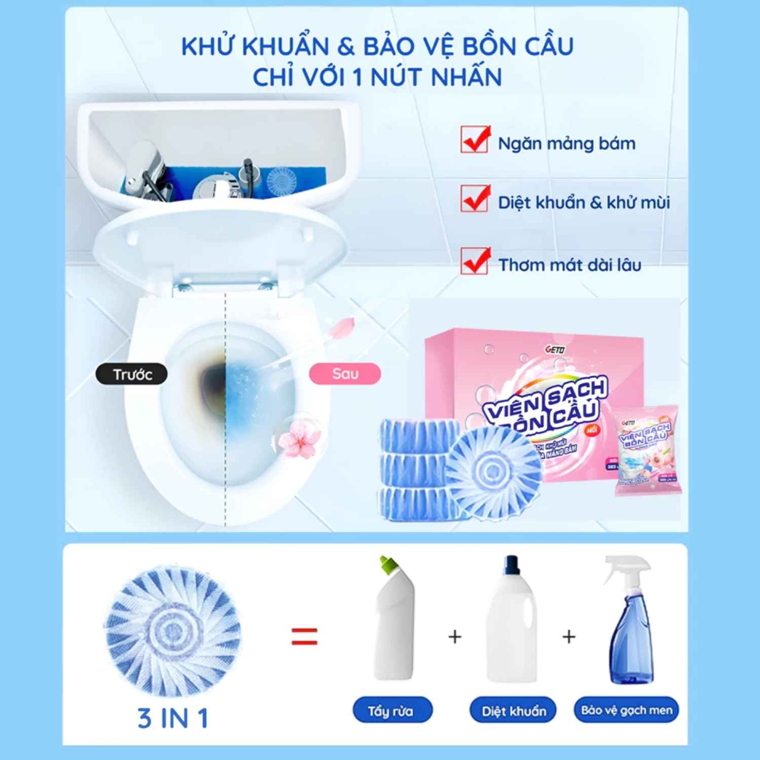 Giữ toilet nhà bạn luôn sạch sẽ, thơm mát với viên thả sạch bồn cầu GETO. Khả năng đánh bay vết bẩn, khử mùi hôi và ngăn ngừa mảng bám vượt trội. Mua ngay!